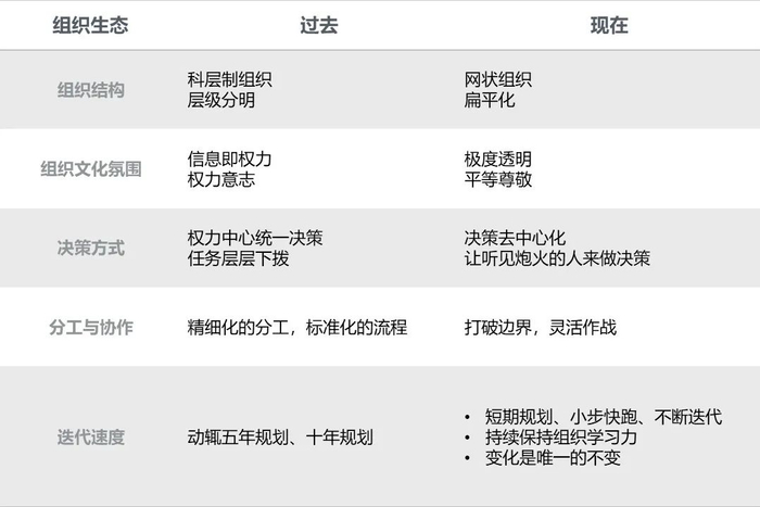 纵向上,组织结构变得越来越扁平,内部不超过三层,汇报对象尽可能减少,砍掉冗余的人。