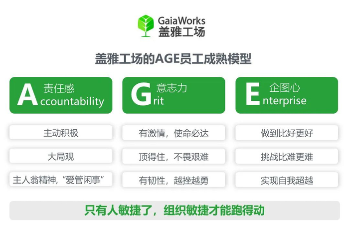 这些年,我们也一直在学习对人才的识别。盖雅定义成熟人才的模型为AGE,A表示责任感,G是意志力,E是企图心(如下图)。但这样的人才其实越来越不容易找。