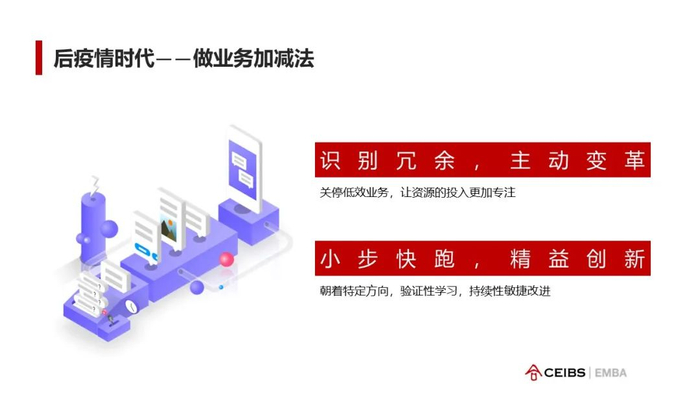 无论大企业还是中小微企业,面对新的市场机遇,都要秉持小步快跑的思路和做法。要主动变革,积极甄别不同业务的价值,关停低效业务,让资源的投入更加专注。另一个关键思想是精益创新,改变过往高举高打、僵化顽固的企业运作模式。