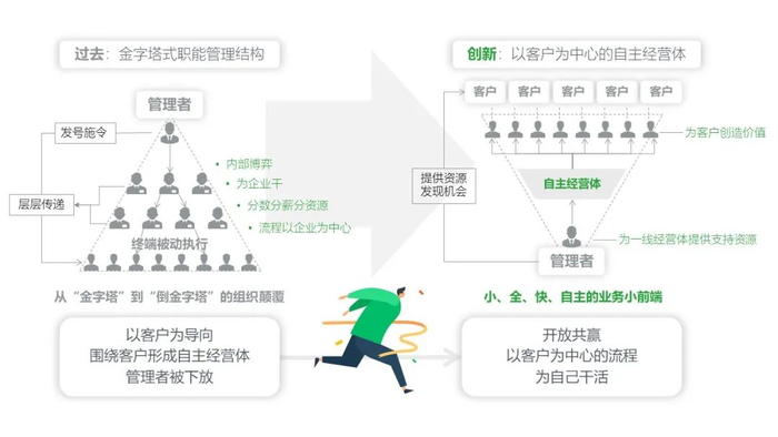 在管理结构上,为了打造敏捷的组织,必须要将金字塔式的自上而下的科层管理结构,创新成为以客户为中心的倒金字塔结构,如下图所示: