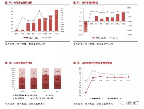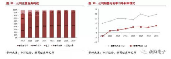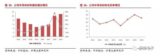 公司主要侧重于新能源行业,半导体材料业务占比相对较低,并且随着新能源行业的需求增加,半导体材料业务占比呈下降趋势。但是从2016年开始,随着半导体产业复苏,公司在半导体材料的收入逐年增加,在半导体材料的毛利率方面也逐年提高,在2019年公司在半导体材料业务的毛利率为25.7%。公司曾承接国家科技重大专项02专项“大直径区熔硅单晶及国产设备产业化”项目,是全球第三家拥有8英寸区熔(FZ法)硅片量产能力的企业,目前公司区熔产片及区熔单晶生长技术已全面达到国际领先水平。由于区熔法制造的硅片具有电阻率高,耐压较高等特点,所以在6-8寸功率器件硅片市场具有较强竞争力。另外,中环股份协同硅片制造设备商晶盛机电在无锡建设8英寸和12英寸直拉法大硅片基地。