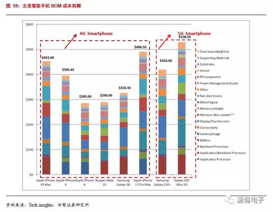 2020年时5G手机大规模量产元年,根据已经发布的三星S20和小米10手机的拆机分析,主要芯片的单机价值量和占比比4G手机进一步提高。三星方面,主要芯片占总物料成本的63.4%,单机价值量已经达到335美元,比Iphone 11pro max高23%。小米方面,主要芯片的占比更高,达到68.3%,主要芯片单机价值量也达到了300美元。根据三星S20和小米10的手机拆解,预计5G手机初期的主要芯片占比约为65%~70%,单机价值量在300-330美元左右。