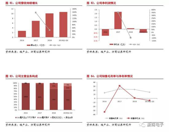 公司的主营业务为半导体硅片和半导体分立器件芯片的研发、生产和销售,以及半导体分立器件成品的生产和销售。半导体硅片产品主要为 8 英 寸、6 英寸及6 英寸以下的硅抛光片与硅外延片;半导体分立器件芯片产品主要为肖特基二极管芯片与 MOSFET 芯片;半导体分立器件成品主要为肖特基二极管。2016-2018年公司半导体硅片业务实现的收入占主营业务收入的比例分别为 57.00%、52.30%和65.62%。