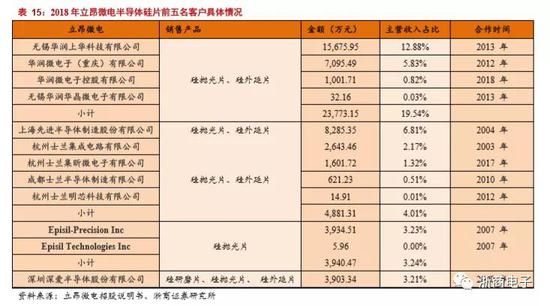 立昂微电子(金瑞泓)的硅片产品主要以8寸及其以下硅片为主,12寸晶圆处于研发阶段。目前立昂微电子的硅片已经成功打入国内部分晶圆厂,公司半导体硅片业务前五大客户分别为华润微电子、上海先进半导体、士兰微、Episil、深爱半导体,2018年主营业务收入占比分别为19.54%、6.81%、4.01%、3.24%、3.21%,五大客户合计营业收入为44783.62万元,合计收入占比为36.81%。其中华润微电子是公司硅片的主要客户,2018年销售金额约为2.4亿人民币,约占总营收的20%。上海先进是公司第二大客户,销售金额约为8300万人民币,占总营收的6.8%。
