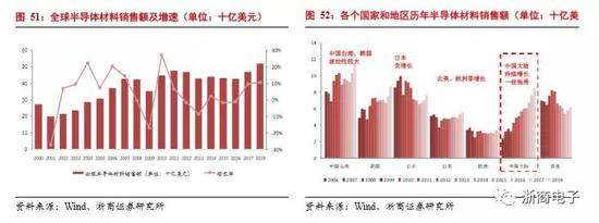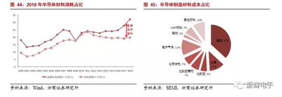 半导体制造材料占比逐年增加。半导体材料可分为封装材料和制造材料(包含硅片和各种化学品等等)。从长期看,半导体制造材料和封装材料处于同趋势状态。但是从2011年之后,随着先进制程的不断发展,半导体制造材料的消耗量逐渐增加,制造材料和封装材料的差距逐渐增加。2018年,制造材料销售额为322亿美元,封装材料销售额为197亿美元,制造材料约为封装材料的1.6倍。半导体材料中,制造材料占比约为62%,封装材料占比38%。