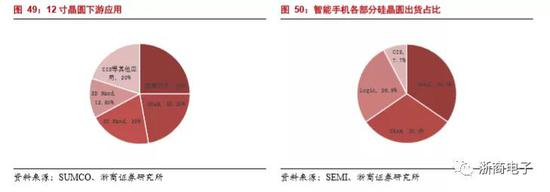 从终端应用来看,全球12寸晶圆消耗以存储器芯片为主,Nand Flash和DRAM存储器总共占比约为75%,其中Nand Flash消耗的晶圆约占33%,其中Nand flash又有35%的下游市场在智能手机市场。可见智能手机出货量和容量的提升是推动12寸晶圆出货的主要因素。在12寸晶圆中,逻辑芯片约占25%,DRAM占比约为22.2%,CIS等其他芯片约占20%。