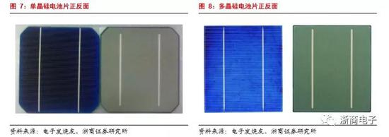 光伏硅片;由于硅元素具有光电效应,所以在光伏领域,大多使用硅片完成太阳能到电能的转换。在光伏领域的硅片,单晶硅电池片一般为圆角方形,颜色为深蓝色,略接近黑色。多晶硅电池片一般为方形,以蓝色和灰色为主,且略带花纹。电池片分为单晶硅片和多晶硅片,单晶硅电池片价格较高,光电转换效率也比较高。