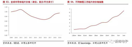 涨价周期+先进制程促进“价”的提升:根据历史上硅片价格测算,目前处于新一轮涨价周期的起始端,在2009年至2011年期间,智能手机迅速普及,手机含硅量提升,单位面积硅片价格持续冲高,并且在2011年达到1.09美元/平方英寸。后来随着硅片库存的升高以及智能手机的销售量下滑,单位面积的硅片价格持续下跌,并在2016年达到最低点,价格为0.67美元/平方英寸。2016年谷歌“阿尔法狗”击败李世石,让人工智能登上了历史的舞台,全球的硅片需求提升,进入新一轮涨价周期阶段。2019年5G手机的发售,单位面积的硅片价格达到了0.94美元。随着2020年的5G手机大面积发售,拉动全球对硅片的需求,预计未来还有2-3年的涨价空间。