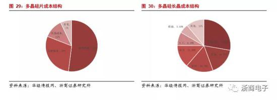 多晶硅制造成本:多晶硅的生产制造过程中不需要拉单晶环节,所以长晶环节的成本占比较低。长晶成本只占总成本的12%。成本的主要来源是硅料成本,约占总成本的52%。其次是切割成本,约占总成本的29%。在多晶硅长晶成本中,石墨热场占比最高,达到28%。其次是坩埚、折旧和电力成本,分别占比为16.7%、16.7%和13.9%。由于多晶硅硅片主要用在光伏产品中,而且有逐渐被单晶硅片代替的趋势,所以多晶硅片的成本下降空间不大。