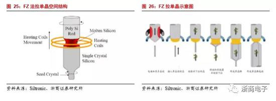 区熔法(FZ)硅片主要用在部分功率芯片中,市场占比约为4%;用FZ(区熔法)制作的硅片主要用作功率器件。并且硅片尺寸以8英寸,6英寸为主,目前约有15%的硅片使用区熔法制作。与CZ法制作的硅片相比,FZ方法最大的特点就是电阻率相对较高,纯度更高,能够耐高压,但是制作大尺寸晶圆较难,而且机械性质较差,所以常常用于功率器件硅片,在集成电路中使用较少。