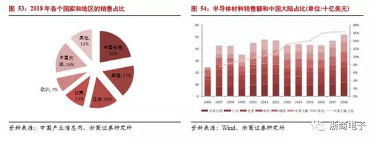 中国半导体材料市场稳步增长。2018年全球半导体材料销售额达到519.4亿美元,同比增长10.7%。其中中国销售额为84.4亿美元。与全球市场不同的是,中国半导体材料销售额从2010年开始都是正增长,2016年至2018年连续3年超过10%的增速增长。而全球半导体材料市场受周期性影响较大,特别是中国台湾,韩国两地波动较大。北美和欧洲市场几乎处于零增长状态。而日本的半导体材料长期处于负增长状态。全球范围看,只有中国大陆半导体材料市场处于长期增长窗台。中国半导体材料市场与全球市场形成鲜明对比。