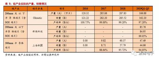 公司在 200mm 及以下半导体硅片(含 SOI 硅片)具有成熟、完善的生产销售体系,与多家全球芯片制造企业建立了长久而稳定的合作关系。200mm 及以下半导体硅片(含 SOI 硅片)产能利用率与产销率均维持在较高水平。公司 200mm 及以下半导体硅片(含 SOI 硅片)产能分布情况:截至 2019 年 9月 30日,公司 200mm 及以下半导体硅片(含 SOI 硅片)在切片、研磨和抛光环节的产能是 21 万片/月(折合成 150mm),单晶生长环节的产能在 36.8 至 44.6 万片/月(折合成 150mm)之间。未来扩产计划。公司正在实施 200mm 半导体抛光片扩产项目和图形化工艺生产线扩产项目,该项目均已于 2017年开始实施,预计 2019 年建设完成,2020 年逐步达产,达产后公司 200mm 半导体硅片单晶生长环节产能将新增 6 万片/月,切片、研磨、抛光环节产能将新增 4 万片/月;200mm 及以下半导体硅片光刻产能将达到 1.5 万片/月,刻蚀产能预计达到 0.7 万片/月。