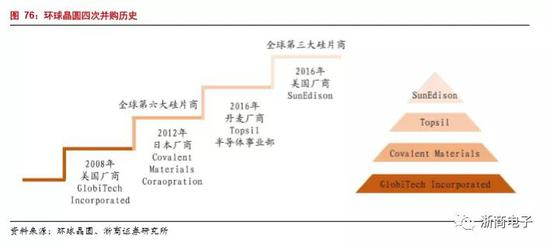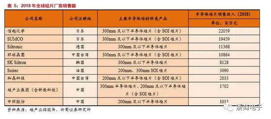 环球晶圆是全球第四大半导体硅片制造商,主要经营地在台湾,是一家台湾证券柜台买卖市场的挂牌企业。环球晶圆原为中国台湾太阳能硅片厂商中美晶旗下半导体硅片业务部门,2011年正式从集团独立,成立环球晶圆。环球晶圆历经四次关键并购成为全球领先的硅片制造商。第一次并购:2008年并购美商Globitech,Globitech为当时全美最大的磊晶厂,公司成功取得德州仪器和MEMC等客户;第二次并购:2012年并购日商Covalent,公司是6英寸至12英寸高规格硅片生产商。并购之后环球晶圆成功获得12寸晶圆技术,并且为客户提供全系列产品,成为全球第六大硅片厂商;第三次并购:2016年并购丹麦Topsil,公司是全球领先的FZ区熔法8英寸硅片制造商。并购之后,环球晶圆成功获得8英寸区熔硅片技术;第四次并购:2016年并购美商SunEdison,公司是美国最大硅片制造商;环球晶圆成功获得美国市场,并在当年成功成为全球第三大硅片制造商,但是在2018年被德国Siltronic超越,成为第四大硅片制造商。