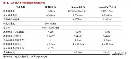从性能参数上来看,技术是现在硅片技术中性能最优异的。技术性能和技术性能相差不大,但是在顶层硅厚度方面,技术生产的硅片更薄,而且从生产成本来说,技术可以重复利用硅片,对于未来的大批量生产情况,技术更有优势,所以现在业界公认以技术为未来硅片发展方向。