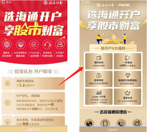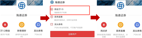 今日早间,海通证券再次修改宣传推介,完全删除了关于佣金率的内容,亦删除了“新客理财参考年化收益率6%”的推介,改为“网点多”、“首席直播”。