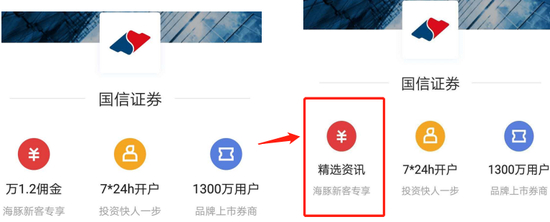 目前事件已有最新进展。昨天深夜,有海豚股票用户向券商中国记者展示的最新页面显示,海通证券已经火速上调交易佣金率(新开户专属)为万1.5;国信证券将“万1.2佣金”的简介删掉,变更为“精选资讯”。