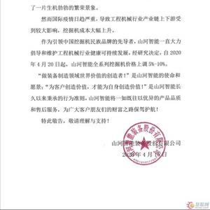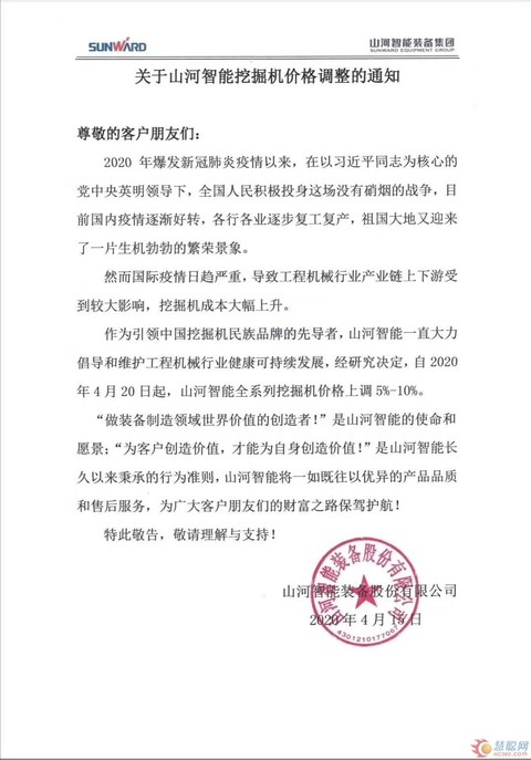作为引领中国挖掘机民族品牌的先导者,山河智能一直大力倡导和维护工程机械行业健康可持续发展,经研究决定自2020年4月20日起,将山河智能全系列挖掘机价格上调5%-10%,于4月15日发布正式公告文件,内容如下: