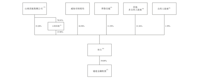 根据招股书披露,山东高速集团有限公司直接持有威海市商业银行33.20%的股份,同时山东高速集团有限公司亦为持股13.96%的山东高速股份有限公司的控股股东,因此直接及间接持股比例为47.16%;威海市财政局、中国重型汽车集团有限公司则各自持有18.5%和16.28%的股份。