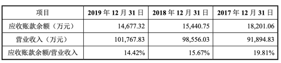2017年至2019年末,越剑智能应收账款余额较大,分别为1.82亿元、1.54亿元及1.47亿元,占当期营业收入的比重分别为19.81%、15.67%及14.42%。