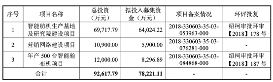 越剑智能公开发行新股的发行募集资金净额为7.82亿元,分别用于“智能纺机生产基地及研究院建设项目”、“营销网络建设项目”、“年产500台智能验布机项目”。