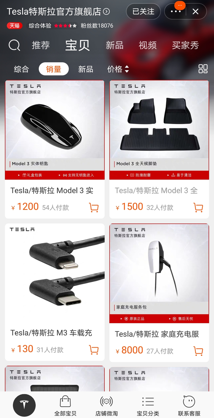 中证君去天猫上逛了逛,Tesla特斯拉官方旗舰店并不售卖整车,首批上架的商品主要为特斯拉在售车型的配件,例如内饰套件、性能脚踏板、道路救援安全套件以及手机快速充电连接板等。