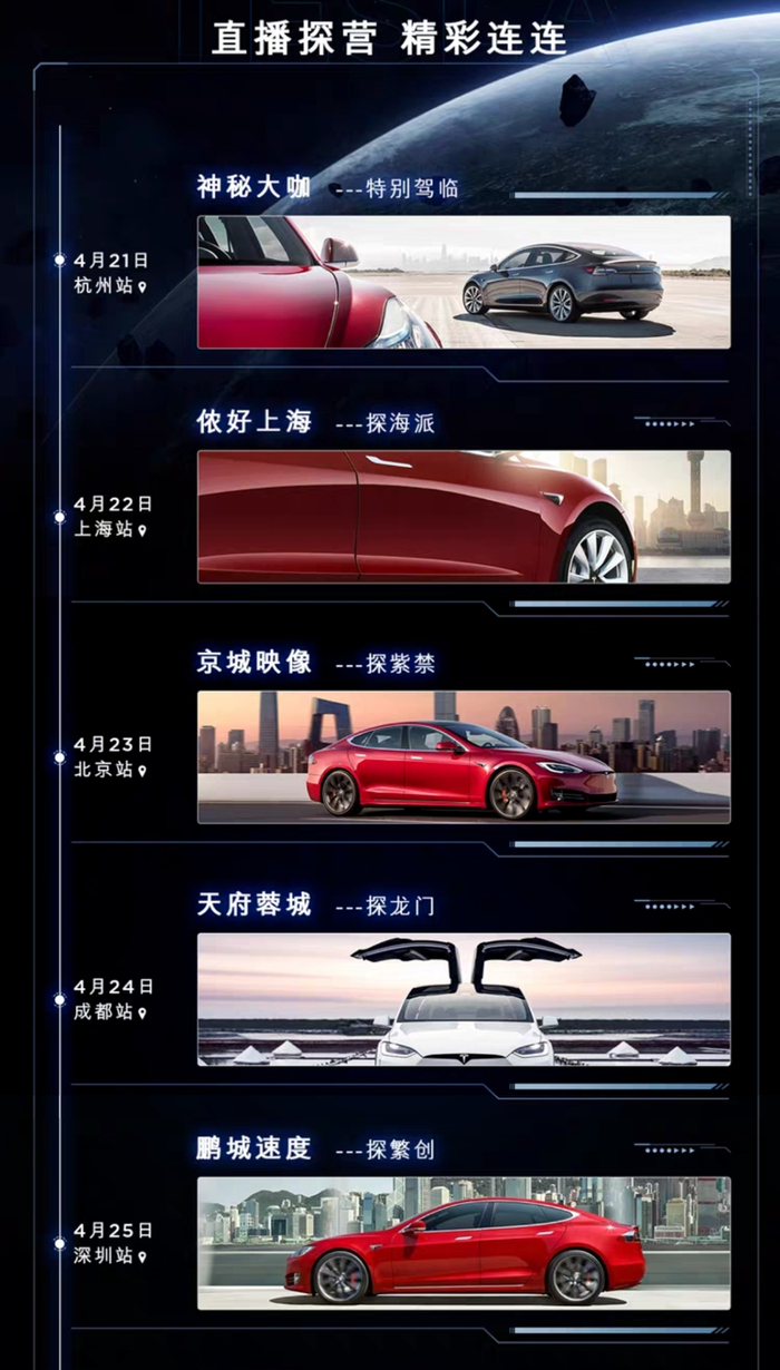 宣传页显示,特斯拉将在杭州、上海、北京、成都、深圳、广州、青岛、重庆8座城市做直播活动。