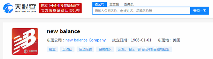 据天眼查,“New Balance” 是知名运动品牌,该品牌运动鞋在我国具有极高知名度和市场占有率,其所属新平衡体育运动公司是美国著名的运动制品生产商。该公司先后在我国商标局注册了 “New Balance”“NB”“N” 字母等系列商标。