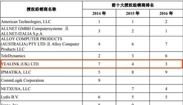 说到亿联网联的主要经销商客户,就必须说一家与亿联网络(Yealink)同名的经销商——YEALINK (UK) LTD。。亿联网络招股书显示,YEALINK (UK) LTD。是亿联网络2015年的第四大客户和2016年的第三大客户,在这两年的销售金额分别为4151.43万元及6844.87万元人民币。招股书还特别提到,YEALINK (UK) LTD。只代理并销售亿联网络的产品,即不代理、销售其他任何公司的产品。