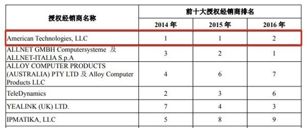 首先来看亿联网络的美国的两家客户。根据亿联网络的招股书和公告,一家名叫American Technologies, LLC的美国经销商是公司最近几年来的重要客户及授权经销商之一。