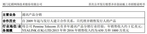 亿联网络在招股书中明确写道:“英国的Pennine Telecom(主要从事多品牌的通信终端设备的销售),2008年开始与亿联公司有业务往来。由于看好亿联产品的未来发展,同时为了更好地推广其代理的Yealink产品,Pennine Telecom的股东于2009年成立YEALINK (UK) LTD。,公司……经过多年的努力,目前YEALINK (UK) LTD。,公司已成为英国通信终端领域重要的销售商,并于2014年成为英国电信(BT)为数不多的IP电话终端的指定供应商之一。该公司除代理销售本公司产品以外,与本公司不存在其他关系,本公司并不持有该公司的股份。”