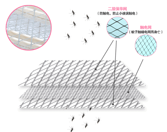 中间那层为工作电网为正极,对人来说是相对安全的低电流电压,而对于蚊虫来说就算强电压了。