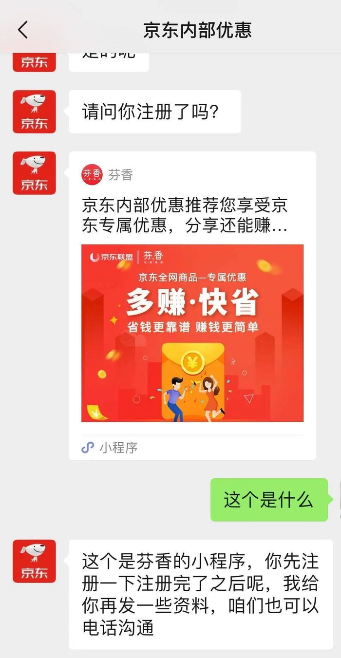老季正试图将我发展为他的下线。他号称是京东芬香合伙人。在加上微信好友的下一秒,他向我发来一个“京东专属优惠”的注册链接。