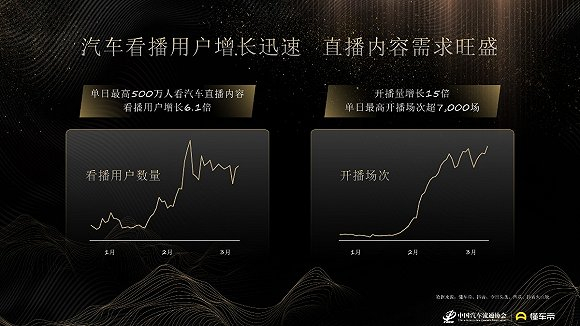 中国汽车流通协会联合懂车帝发布的《2020汽车直播生态报告》中提到,今年前三月汽车直播单日最高看播人数达500万,看播用户增长6.1倍。开播量增长15倍,单日最高开播场次超7000场。开播主播人数增长12倍,新主播日新增10%。