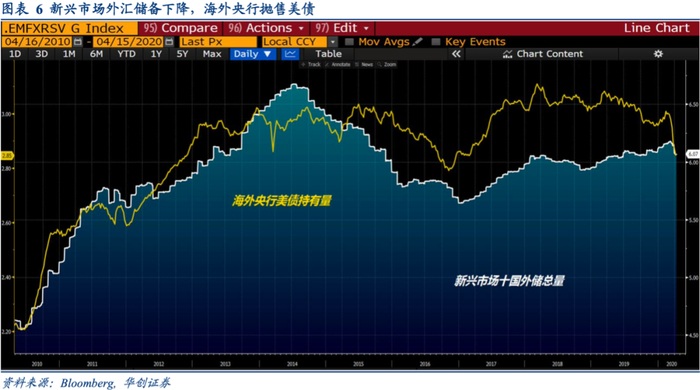 美元储备方面,非美国家的官方美元存量下降是关键。包含中国在内10个大型新兴市场国家的外汇储备从2014年7月6.7万亿美元跌至2017年1月5.6万亿美元,2020年3月这一数字从6.18万亿美元下降至6.06万亿美元,单月降幅达到1200亿美元。海外央行和主权财富基金的美元储备减少,其直接结果是离岸商业银行的美元定期存款(TDs)和大额存单(CDs)的需求不足,如果为了维稳汇率或者应对财政赤字卖出美债,等于增加在岸商业银行的准备金。不同于2008年雷曼破产以后持续买入美债,本次美元流动性危机期间海外央行是抛售美债,可以说美元储备下降加剧了离岸与在岸银行间的短期融资差异。