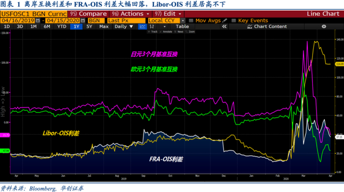 过去两周时间里美联储通过央行美元互换向全球金融体系累计注入3966亿美元流动性,远期利率协议与隔夜指数互换利差(FRA-OIS Spread)从78个基点回落至37个基点,欧元和日元的基准互换(Basis Swap)回到零附近,美元互换融资成本罕见回到平价,显示离岸美元流动性短缺得到明显缓解,然而一个奇特的现象摆在市场面前,即: 伦敦同业拆借利率与隔夜指数互换利差(Libor-OIS Spread)并未跟随上述两个指标下行,而是一路往上然后缓慢回落,目前仍远远高于正常水平。
