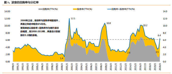 波音长期股价上涨的支撑是基本面。1990-2019 年,波音的复权股价上涨了 24.2倍。净利润仅在 1998 年、现金流仅在 2008 年有过短暂的负值,其余年份均有持续的盈利,这也是股价能长期上涨的重要支撑。2000 年之后,公司的股息率与回购率明显提升,两者之和的中枢在 6%左右。若简单的以股息率+回购率作为推升股价的幅度,则 1990-2019 年,两者合计贡献股价 3.2 倍的涨幅。可见分红与回购对股价有正面作用,但推动股价长期上行的核心仍是盈利。