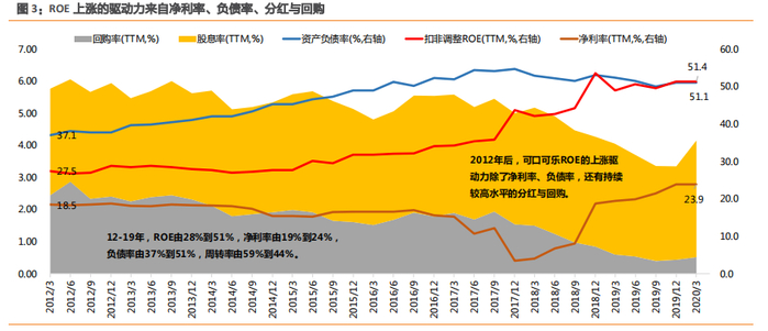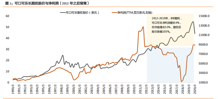2012-2019 年,可口可乐的 ROE由 28%上升到 51%,在这过程中,股价上涨并非由利润直接驱动,而是来自持续较高的 ROE,代表的是权益投资者的回报率。因此,可以认为,2012 年后,可口可乐股价上涨的驱动力来自 ROE,而 ROE 的上涨驱动力除了净利率、负债率外,还有持续较高水平的分红与回购的作用。