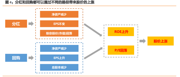 公司利润和未分配利润的利用方式,主要有分红、回购、再投资三种方式。对于分红与回购来说,都以通过不同的路径带来 ROE 和股价的上涨。具体来说: