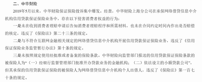 另外,对于中华联合财产保险股份有限公司(下称“中华财险”)的通报提到,2019年5月以来,中华财险保证保险投诉集中爆发。经查,中华财险上海分公司在承保网络借贷信息中介机构信用贷款保证保险业务中,存在多项违规行为。