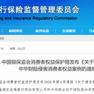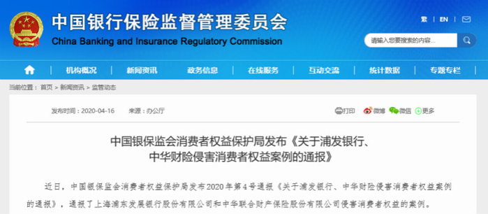 4月16日,银保监会网站公布了一则关于浦发银行和中华财险侵害消费者权益案例的通报。