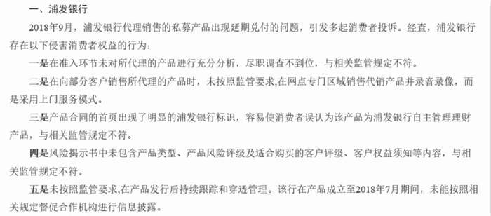 具体来看,2018年9月,浦发银行代理销售的私募产品出现延期兑付的问题,引发多起消费者投诉。经查,浦发银行存在多个侵害消费者权益的行为,比如在准入环节未对所代理的产品进行充分分析,尽职调查不到位;在向部分客户销售所代理的产品时,未按照监管要求,在网点专门区域销售代销产品并录音录像,而是采用上门服务模式。