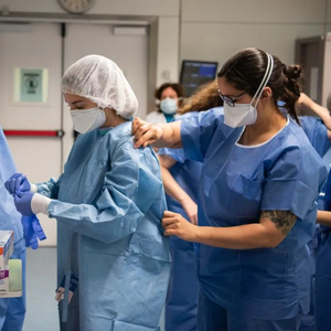 4月9日,在西班牙巴塞罗那医院,医务人员穿戴防护服,准备进入病房