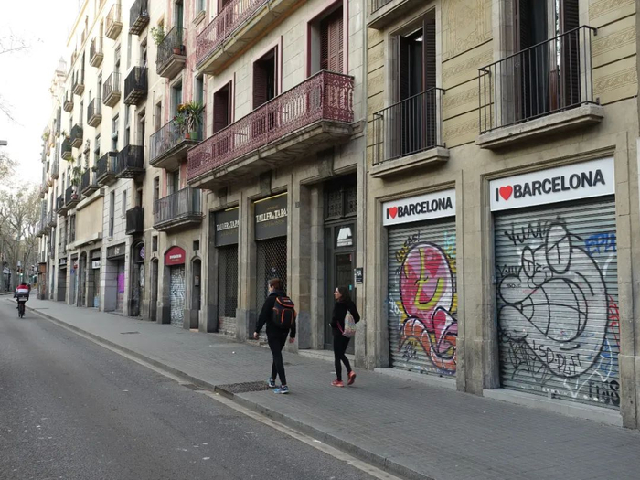 3月14日,西班牙巴塞罗那兰布拉大道旁边的商店关门停业。西班牙首相桑切斯14日宣布,为遏制新冠肺炎疫情蔓延,西班牙即日起在全国范围内实施为期15天的“封城”措施