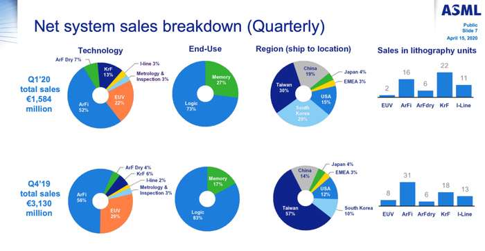 净销售额为24亿欧元,低于我们原来的指导价31亿至33亿欧元,这主要与COVID-19的影响有关。16亿欧元的系统净销售额中,逻辑业务占比73%,其余27%来自于存储器,这显然显示出逻辑业务的持续强势。我们在一季度实际出货了四套EUV系统,但我们只在其中的两套系统上确认了收入,我将在后面详细介绍。