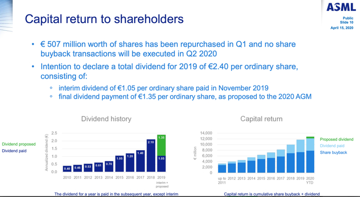 正如上季度所通报的那样,ASML已经在2020年股东大会上提交了一项提案,提议宣布2019年的总分红为每股普通股2.40欧元。考虑到2019年11月支付的1.05欧元的中期股息,这导致第二季度将支付1.35欧元的末期股息。这与2018年的股息相比,增加了14%。2020年的年度股东大会将于4月22日在维尔德霍芬举行。