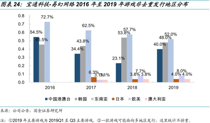 公司游戏以中国港澳台、东南亚和韩国为三大主力市场,向日本和欧美等多海外市场拓展,布局全球游戏发行业务。公司3Q2019,公司主要游戏发行地区中面向中国港澳台、韩国、东南亚、日本、欧美和澳大利亚发行游戏数量占比分别为40%/48%/52%/4%/8%/4%,其中日本和欧美市场在近3年内拓展节奏良好。面向日本和东南亚市场的游戏《黑暗与荣耀》在2019年前三季度贡献收入1534万元,占主要游戏收入的1.5%;面向欧美、东南亚和澳大利亚的游戏《圣堂之战》和面向欧美的游戏《魔神世界》在2019年前三季度分别贡献收入1.42亿元和1730万元,分别占主要游戏收入的13.7%和1.7%,尚有较大的提升空间。