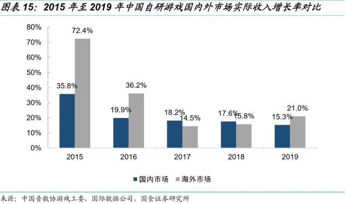 国内自研手游出海收入保持高增速,抢占海外市场份额超16%。国内自研游戏出海收入2019年为116亿美元,同比增长20.9%,其中2018年中国移动游戏占海外移动收入比重15.8%。对比自研手游的国内收入规模,2019年1895亿元,同比增速为15.3%,出海收入与国内收入相对比例约为42.8%,这一指标在2018年约为40.8%,同比提升2pct。自研游戏在国内外市场实际收入同比增速对比来看,海外市场同比增速2019年超出国内市场5.7pct。而纵观整体海外移动市场规模,2018年中国移动游戏占比相比2015年提升4.8pct。