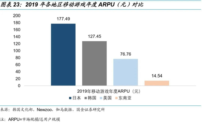 提高付费率和ARPPU值:日本、韩国和美国用户人均付费水平高,持续外拓市场公司预计可能提升单游戏流水上限。以移动游戏市场规模与总用户基数的比值来指代移动游戏的ARPU值,日本移动游戏年度ARPU为177.49元,是东南亚的约12倍;是韩国的约1.4倍;美国移动游戏年度ARPU为76.76元,是东南亚的约5.3倍。