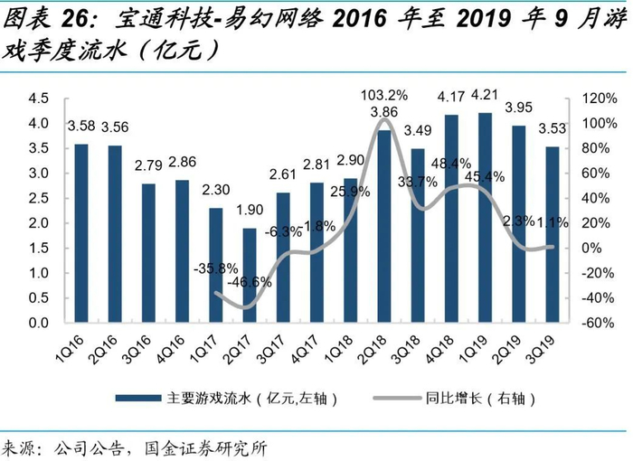 手游全球发行运营能力不断得到验证,2018 年主要游戏季度流水同比增速均超25%。公司1Q18至4Q18主要游戏流水增速分别为25.9%/103.2%/39.7%/48.4%,1Q19至3Q19主要游戏流水增速分别为45.4%/2.3%/1.1%。2018年公司发行的《三国群英传》、《豪门足球》、《九州天空城》、《食之契约》、《武林外传》等多个爆款游戏为流水增长提供支撑。同时, 4Q18发布的 S 级产品《我叫 MT4》、《万王之王》等进一步推动其游戏流水表现。