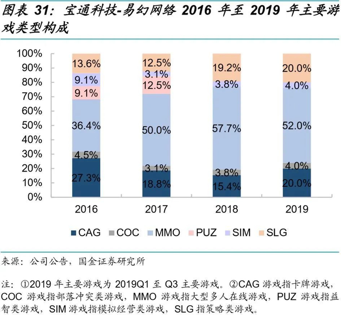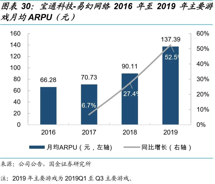 重度游戏运营且推新节奏良好,带动月均ARPU高速增长。公司主要游戏月均ARPU高速增长,2019年前三季度月均ARPU超137元,相较2018年提升53%。从游戏类型数量分布来看,主要游戏中MMO、CAG和SLG游戏数量占比较高,2019年前三季度分别为52%/20%/20%,其中CAG和SLG游戏数量占比相较2018年提升4.6pct和0.8pct,而重度游戏相对而言对于游戏月均ARPU的拉动效应较为显著,从而拉动业绩增长。